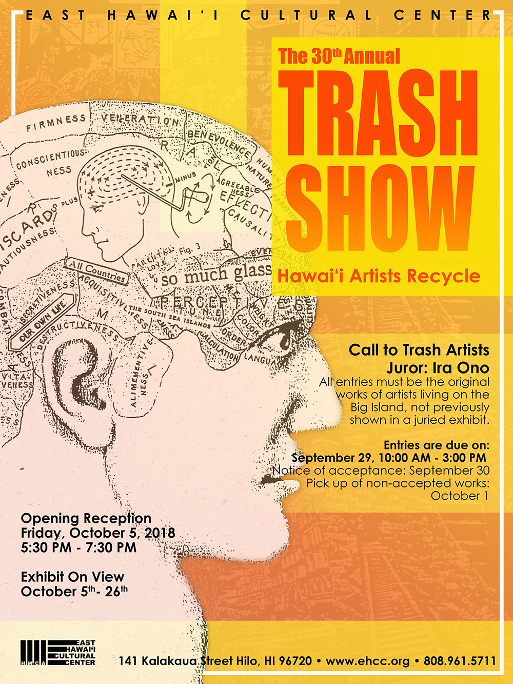 Ira Ono, founder of “The Trash Show: Hawaii Artists Recycle,” will be returning to jury the 30th anniversary edition of one of East Hawaii’s longest-running annual arts events. The show runs from October 5-26, beginning with a gala opening on Friday, October 5, from 5:30-7:30 p.m., followed by a special dance performance, “My Empty Body is Full of Stars,” by the Prince Dance Theatre company, starting at 7:30 in EHCC’s upstairs performance space, (the gallery will close at this time).