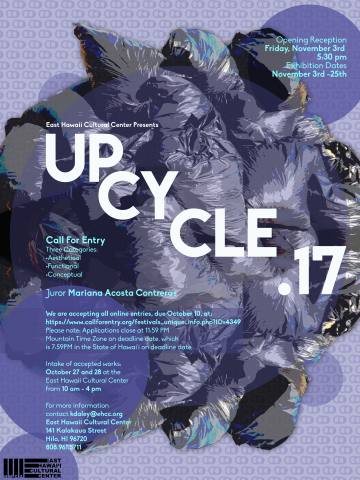 Please Note for UPCYCLE.17: After the October 10th CaFE deadline closes- We will extend the submission deadline to October 24th for all BIG ISLAND RESIDENTS ONLY with a discounted entry fee *EHCC membership NOT required for discount price*