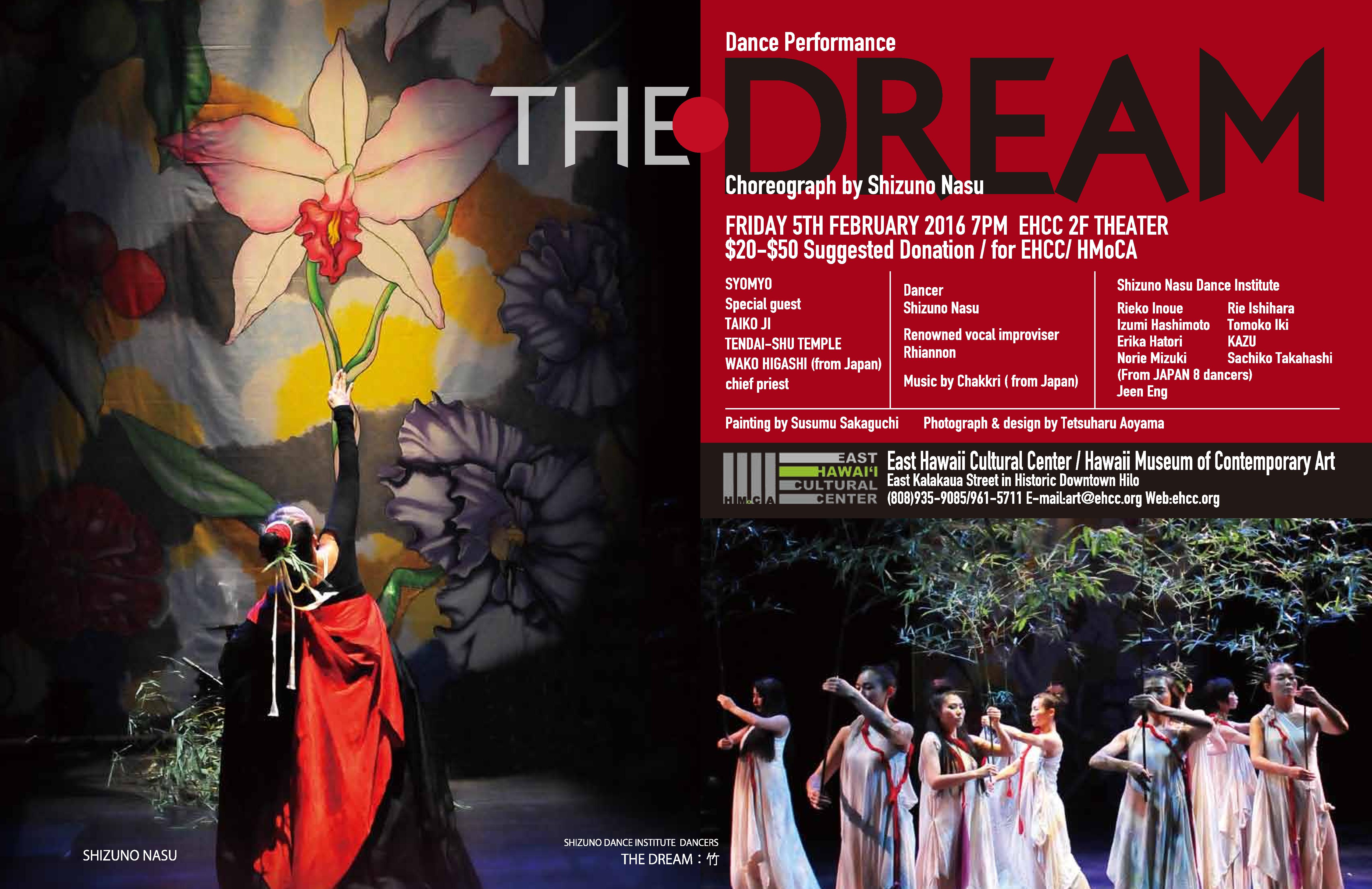 Shizuno Nasu embodies the Asian spirit and Hawaii's powerful nature. Integrating F'u Sui Ka, the movements of swaying in the wind, the flowing of water, and the flaming and flickering of our inner energy, as well as her original spiral movements, Shizuno Nasu and company become one with the elements. Thru creative and completely improvised dance and conscious breath, this company of artists blend the extremes of big nature and the gentleness
