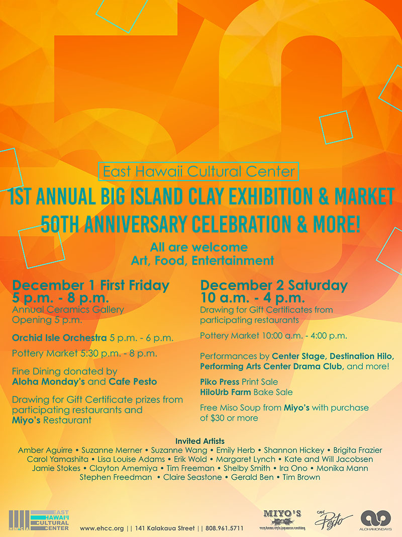 Join us for the First Annual Big Island Clay Exhibition and Market 50th Anniversary Celebration and more! All are welcome!