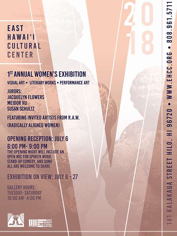 Opening reception is July 6th from 6-9PM which will include an evening of gamelan, Apokolani Band with songwriters Yvonne Yarber Carter, Keoki Apokolani Carter and featured local musicians and friends, and Open Mic for Spoken Word, Improve, and Poetry Readings.